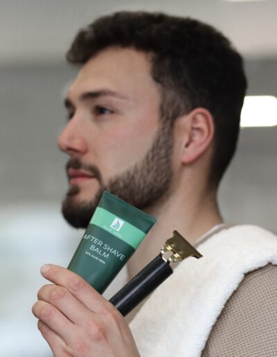 „Nach der Rasur einfach eine kleine Menge des Balms gleichmäßig auf die trockene Haut auftragen und sanft einmassieren. Du wirst spüren, wie das Spannungsgefühl sofort nachlässt. Kurz einziehen lassen und den Tag genießen!“