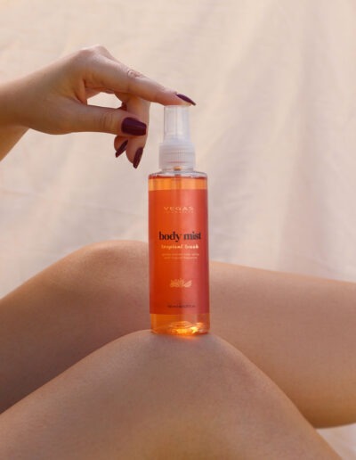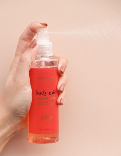 Vaporisez-le Brume corporelle „ Toucher tropical “ Appliquez généreusement sur tout le corps – idéalement juste après la douche ou entre les douches lorsque vous avez besoin de vous rafraîchir.