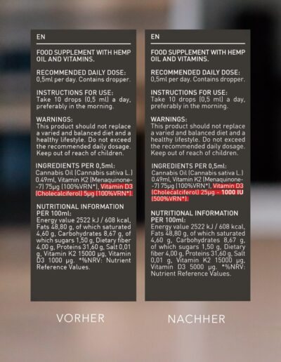 Bioverfügbarkeit: Da die Vitamine D3 und K2 fettlöslich sind, sorgt das hochwertige Hanföl für eine optimale Aufnahme durch deinen Körper.